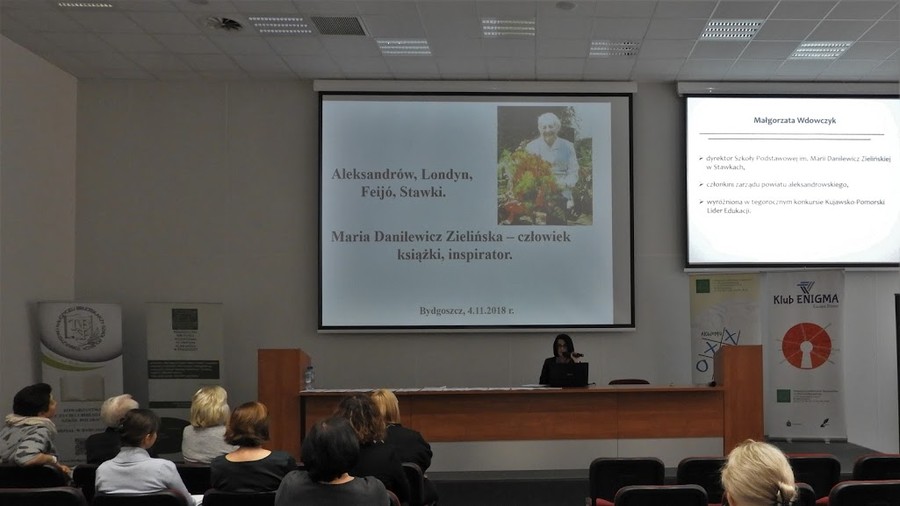 Następnie prelegentka Małgorzata Wdowczyk, dyrektor Szkoły Podstawowej im. Marii Danilewicz Zielińskiej w Stawkach zaprezentowała temat „Aleksandrów, Londyn, Feijó, Stawki. Maria Danilewicz Zielińska – człowiek książki, inspirator”.