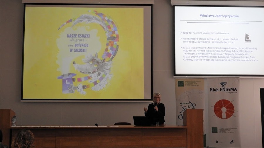 Drugą prelegentką była Wiesława Jędrzejczykowa, redaktor naczelna Wydawnictwa Literatura, która wygłosiła prelekcję „Wartości w literaturze dla dzieci”. Zaprezentowała jednocześnie wiele mądrych i ciekawych książek, ukazujących się nakładem tego wydawnictwa.