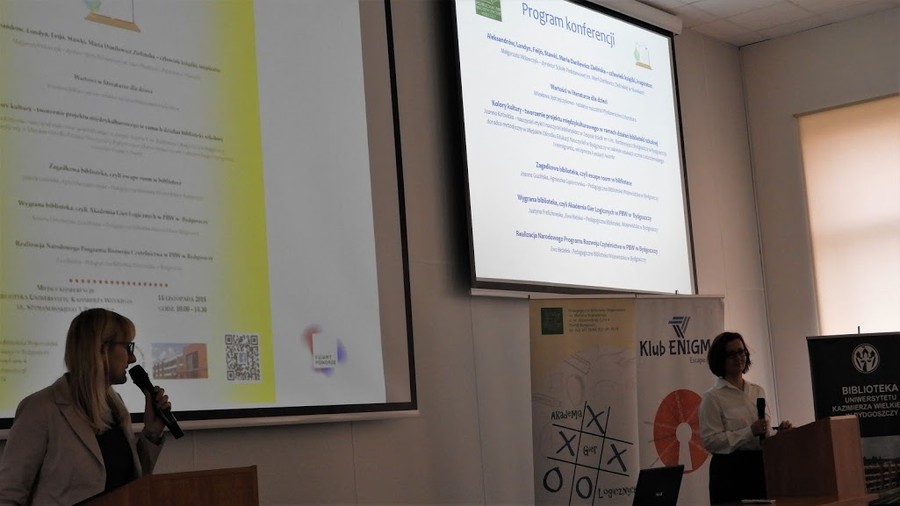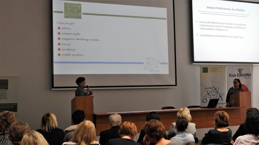 Kolejny temat konferencji dotyczył roli gier w bibliotece i brzmiał „Wygrana biblioteka, czyli Akademia Gier Logicznych w PBW”. Przedstawiły go Ewa Bielska i Justyna Frelichowska, nauczyciele bibliotekarze Wydziału Gromadzenia i Opracowania Zbiorów Pedagogicznej Biblioteki Wojewódzkiej, a jednocześnie inspiratorki wspomnianej Akademii.