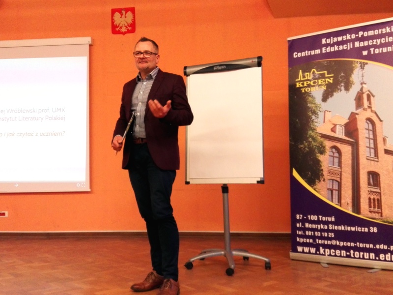 Zaproszony na spotkanie dr hab. Maciej Wróblewski, prof. UMK, rozpoczął wykład od przytoczenia słów Josifa Brodskiego, który podkreślał w swoim noblowskim wykładzie (8.12.1987) rolę literatury i poezji w budowaniu świata niezależnego, zróżnicowanego i upodmiotowionego, w budowaniu poczucia niezależności. Natomiast Mario Vargas Llosa upominał się o obronę książki i czytania jako ostatnich bastionów niezależnych sądów. Prelegent wyróżnił trzy strategie czytania: pragmatyczną, antropologizującą oraz parnasistowską. Mówił o tym, że nierzadko zniechęcamy młodzież i dzieci do czytania, wybierając motywację negatywną, strasząc ucznia oceną niedostateczną, jeśli nie przeczyta lektury. Sugerował, że nie potrafimy znaleźć właściwego sposobu, aby rozmawiać z wychowankami o literaturze. Profesor mówił o badaniach i o raporcie diagnozującym sytuację czytelnictwa w Polsce, prowadzonym przez Bibliotekę Narodową, a następnie zaproponował kilka podpowiedzi, co robić w tej niełatwej sytuacji.