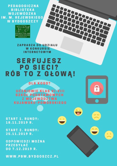 Pedagogiczna Biblioteka Wojewódzka im. Mariana Rejewskiego w Bydgoszczy ogłasza konkurs pt. „Serfujesz po sieci? Rób to z głową!“ skierowany do uczniów klas VI-VIII szkół podstawowych z województwa kujawsko-pomorskiego. Na laureatów czekają atrakcyjne nagrody!