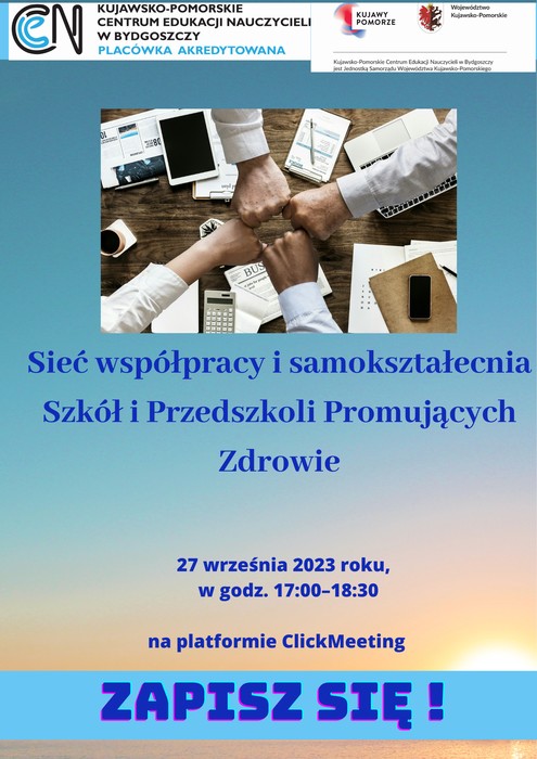 Kujawsko-Pomorskie Centrum Edukacji Nauczycieli w Bydgoszczy zaprasza na pierwsze spotkanie przedstawicieli szkół i przedszkoli promujących zdrowie. Omówione zostaną sprawy związane z wprowadzeniem zmian w placówkach w obszarze promocji zdrowia.  Spotkanie odbędzie się 27 września 2023 roku o godz. 17.00 w budynku KPCEN w Bydgoszcz przy ul. Jagiellońskiej 9.