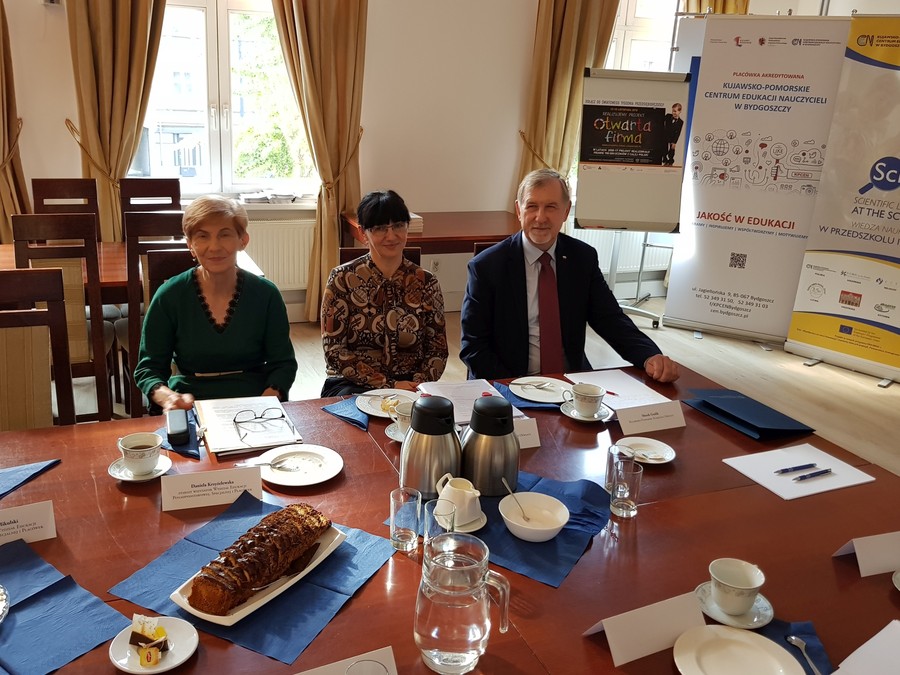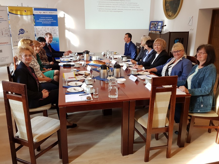 W spotkaniu uczestniczyli: Marek Gralik Kujawsko-Pomorski Kurator Oświaty, Małgorzata Oborska Kujawsko-Pomorski Wicekurator Oświaty, Daniela Krzyżelewska starszy wizytator Wydziału Edukacji Ponadpodstawowej, Specjalnej i Placówek, Kazimierz Mikulski starszy wizytator Wydziału Edukacji Ponadpodstawowej, Specjalnej i Placówek. KPCEN w Bydgoszczy reprezentowali: Robert Preus dyrektor KPCEN, Violletta Panfil-Smolińska wicedyrektor KPCEN, Wiesława Kitajgrodzka kierownik Pracowni Dydaktyki, Doradztwa i Innowacyjnej Edukacji, Krystyna Karpińska kierownik Pracowni Informacji i Promocji, Izabela Nowakowska kierownik Pracowni Zarządzania, Diagnozy i Wychowania, Grażyna Szczepańczyk nauczyciel konsultant edukacji wczesnoszkolnej, Iwona Rostankowska nauczyciel konsultant edukacji humanistycznej, Justyna Adamska nauczyciel konsultant języka angielskiego.