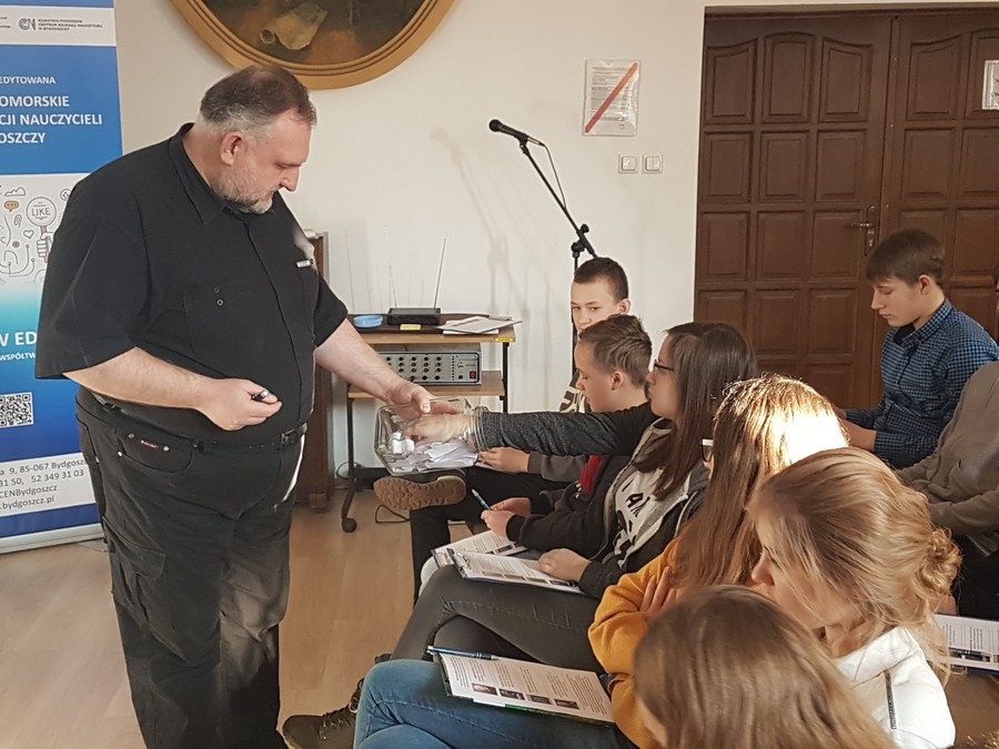 W lekcji otwartej brali udział uczniowie klasy VIII Szkoły Podstawowej nr 32 w Bydgoszczy wraz z wychowawczynią Joanną Moczadło.