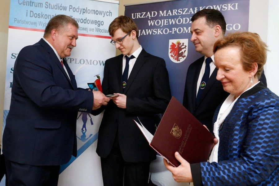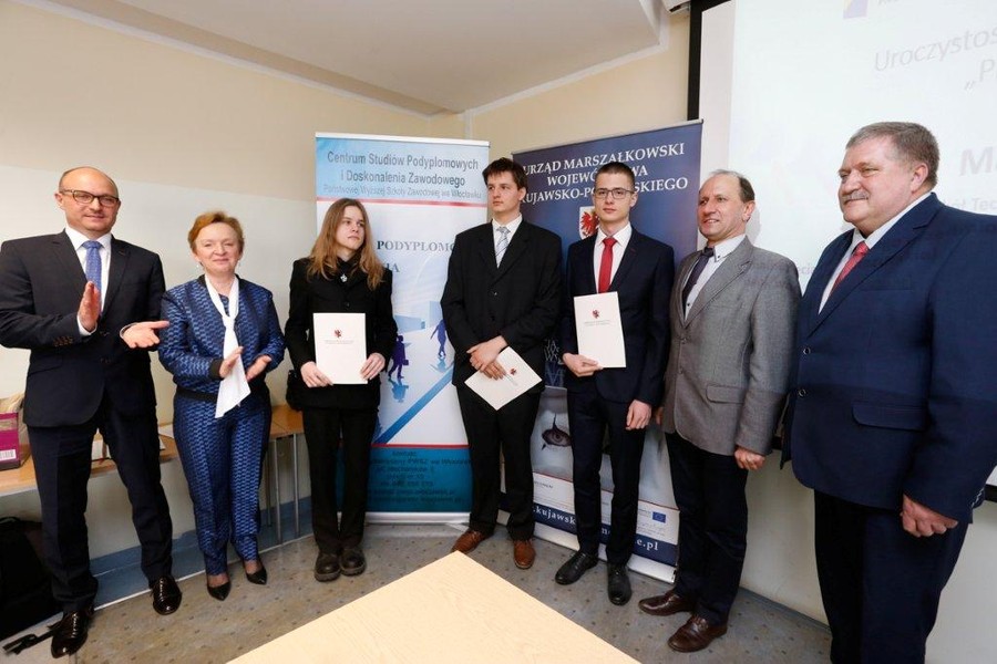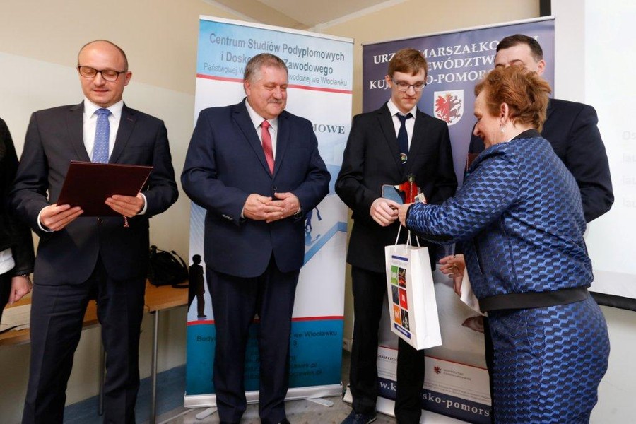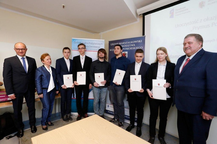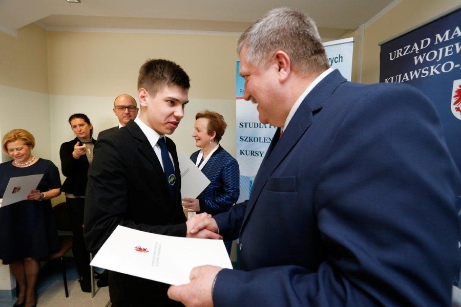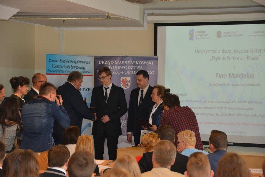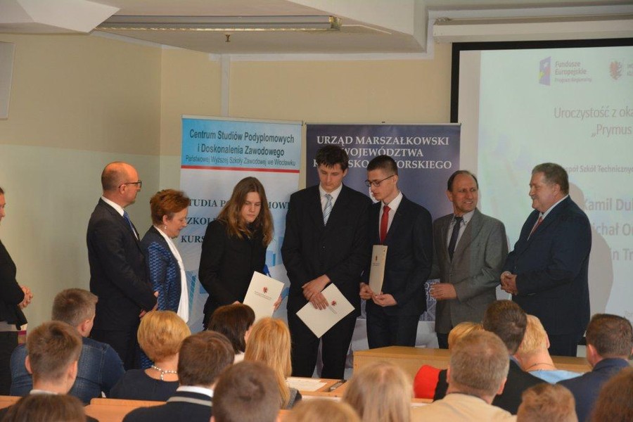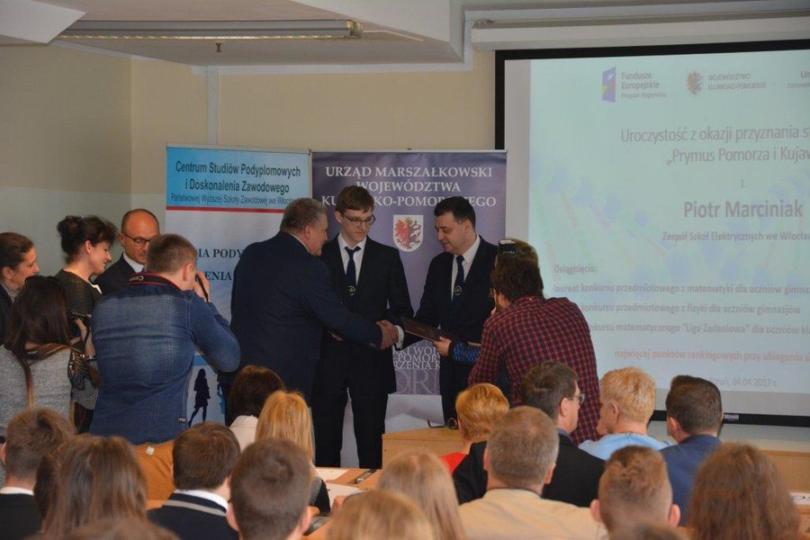 Z rąk Członka Zarządu Województwa Kujawsko-Pomorskiego Sławomira Kopyścia stypendyści otrzymali listy gratulacyjne, a najlepszy stypendysta projektu w kategorii techników – Piotr Marciniak z Zespołu Szkół Elektrycznych we Włocławku – otrzymał statuetkę „Prymusa Pomorza i Kujaw”. Gratulacje stypendystom złożył także Prezydent Miasta Włocławek Marek Wojtkowski.