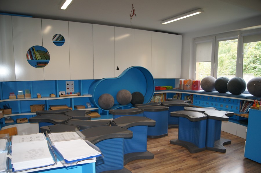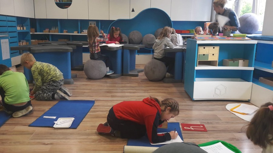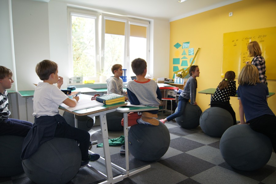 - uczniowie nie siedzą w tradycyjnych ławkach, a przestrzeń sal jest innowacyjnie zaprojektowana.