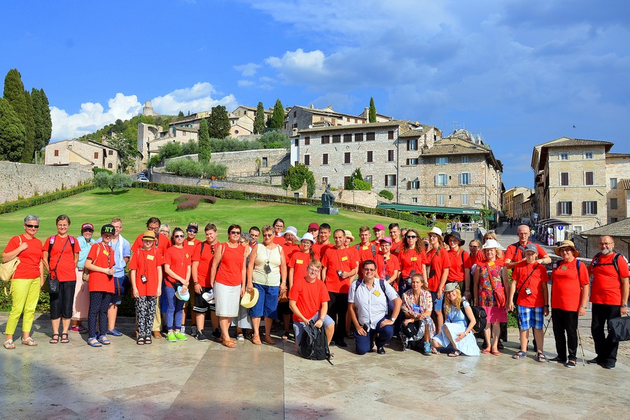 W Asyżu, mieście św. Franciszka i św. Klary pielgrzymi, przechodząc wąskimi średniowiecznymi ulicami miasta, zwiedzili bazyliki: św. Franciszka, św. Klary i Matki Bożej Anielskiej. Wizyta w tym mieście była okazją do przypomnienia inicjatywy Jana Pawła II, który 27 października 1986 r. zaprosił do Asyżu przedstawicieli Kościołów chrześcijańskich oraz wielkich religii świata na międzyreligijne spotkanie modlitewne w intencji pokoju na świecie pod nazwą: „Światowy Dzień Modlitwy o Pokój”. Hasłem przewodnim spotkania było: „Być razem, aby się modlić”.