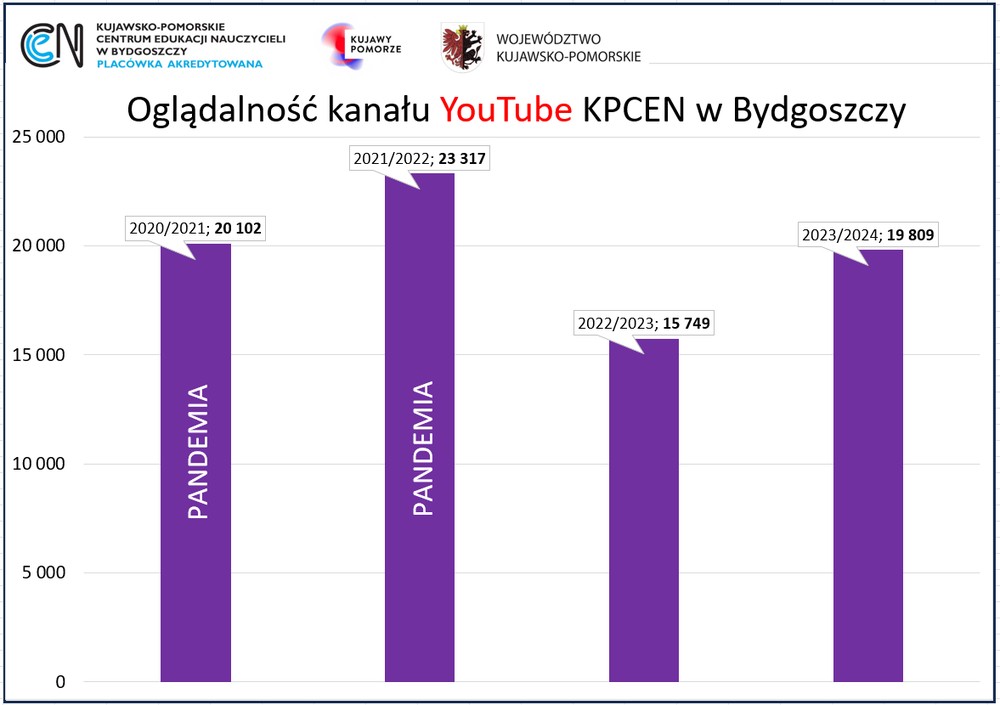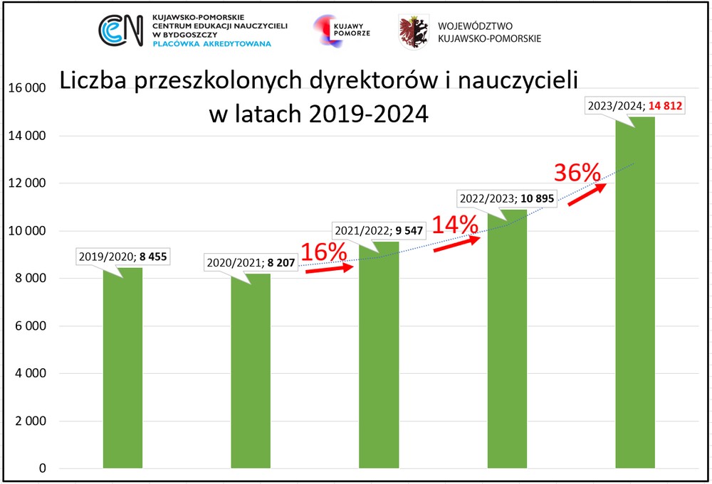 Był niezwykły, obfitujący w wiele wydarzeń i szkoleń. Gościliśmy wspaniałych ludzi (np. wielokrotnego mistrza świata w wieloboju Sebastiana Chmarę), jeszcze bardziej otworzyliśmy się na współpracę z podmiotami edukacyjnymi i instytucjami, zatrudniliśmy 7 nowych doradców metodycznych, nasi nauczyciele napisali 27 ważnych artykułów w UczMy i kilka publikacji zwartych, zorganizowali 829 grup szkoleniowych, w tym kilkadziesiąt konferencji oraz przeszkolili 14 812 dyrektorów i nauczycieli. Przyjęliśmy 3 wizyty studyjne, a sami byliśmy na dwóch, w tym poznawaliśmy norweski system edukacyjny.  Na kanale YouTube umieściliśmy 49 filmów edukacyjnych, które obejrzało blisko 20 tys. internautów. Byliśmy organizatorami nietypowych wydarzeń, np. Igrzysk Lekkoatletycznych dla Nauczycieli i Pracowników Oświaty. Zgłosiliśmy do Ogólnopolskiego Konkursu Drzewo Roku kasztanowca, na którego głosowało ponad 3 tys. mieszkańców województwa kujawsko-pomorskiego. Ogromna praca, przede wszystkim zespołowa, przyniosła wspaniałe efekty i duży progres, który widać na poniższych wykresach i diagramie.