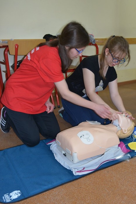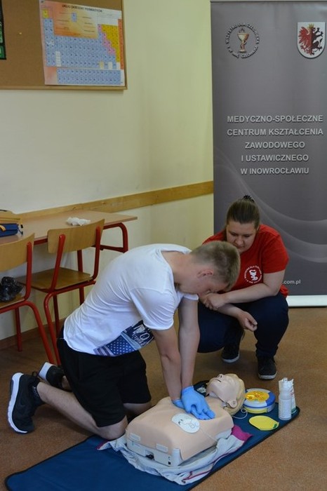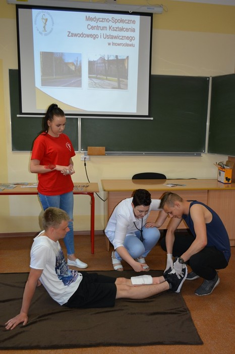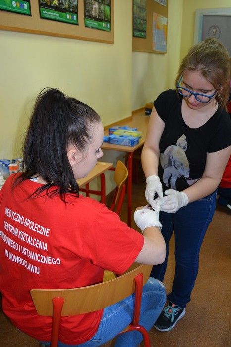 Podczas spotkania uczennice „Medyka”: Joanna Pietruszka, Katarzyna Waszkiewicz, Żaneta Dudziak, Sara Reimann pod kierunkiem Moniki Kurzawy oraz  Moniki Kwaśniewskiej-Adryan,  zaprezentowały zasady udzielania pierwszej pomocy. Uczestnicy zdobyte informacje mogli wykorzystać podczas ćwiczeń na stanowiskach pozorowanych z użyciem fantomów oraz specjalistycznego sprzętu medycznego.  Była to doskonała okazja do przećwiczenia resuscytacji krążeniowo-oddechowej z wykorzystaniem defibrylatora AED, zabezpieczenia ran i złamań. Młodzież miała również okazję wczuć się w rolę poszkodowanego dzięki wykorzystaniu  zestawu do pozoracji ran.