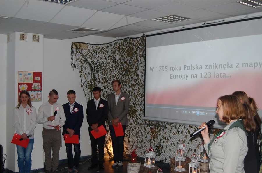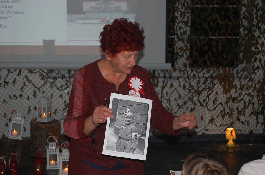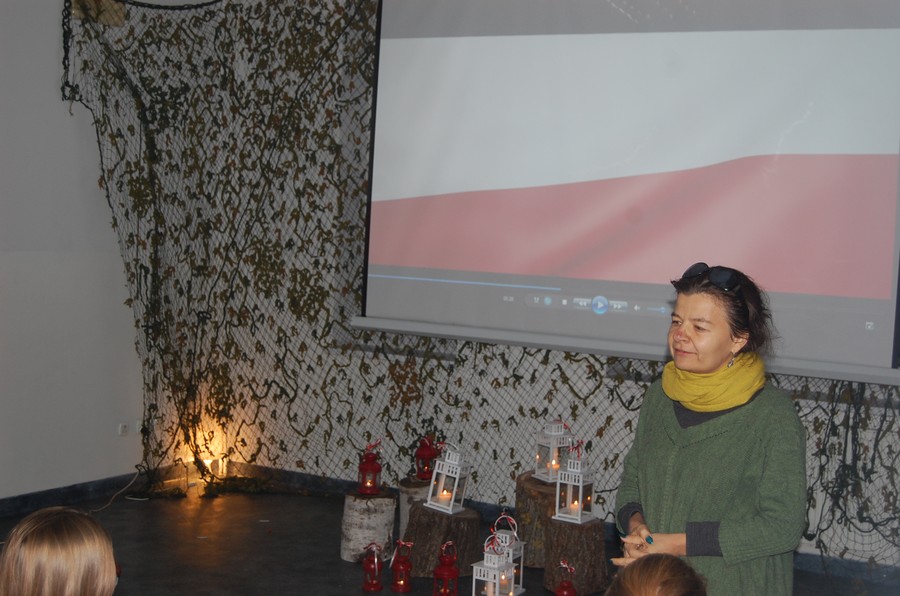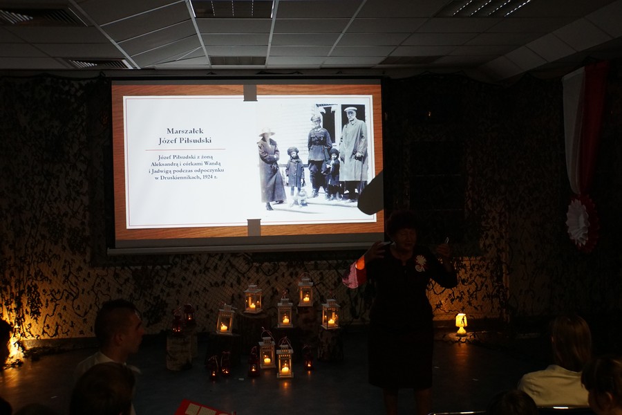 Piękny wystrój oraz blask świec potęgował podniosły nastrój tego wydarzenia. Wieczornica miała charakter międzypokoleniowy, albowiem artystyczny występ młodzieży w odświętnych strojach i wspólne odśpiewanie szeregu pieśni patriotycznych był zaledwie preludium do występu dwojga znamienitych gości, którzy z niezrównaną pasją zabrali nas w czasy międzywojnia i zapoznali nas z sylwetkami wybitnych Polaków. Pierwszą prelegentką, która była uprzejma podzielić się z nami swą wiedzą na temat postaci marszałka Józefa Piłsudskiego oraz generała Józefa Hallera, była pani Anna Rojewska, działająca społecznie w Fundacji Generał Elżbiety Zawackiej oraz Archiwum i Muzeum Pomorskim AK i Wojskowej Służby Polek w Toruniu. Pani Anna bynajmniej nie ograniczyła się do streszczenia losów obu wybitnych wodzów w oparciu o multimedialną prezentację, ale była tak wspaniałomyślna, że przyniosła ze sobą kilka eksponatów oraz pamiątek i obdarowała nimi naszych wychowanków. Kolejnym gościem, który odpowiedział na nasze zaproszenie była pani Agnieszka Malik, przewodniczka PTTK i działacz społeczny, która przybliżyła nam postacie oraz niepodległościową działalność Ottona i Heleny Steinbornów, wybitnych toruńczyków, którzy bogactwem swych życiorysów mogliby z powodzeniem obdarzyć jeszcze kilka innych osób.
