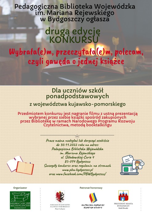 Pedagogiczna Biblioteka Wojewódzka im. M. Rejewskiego w Bydgoszczy zaprasza młodzież ze szkół ponadpodstawowych z województwa kujawsko-pomorskiego do udziału w drugiej edycji konkursu „Wybrała(e)m, przeczytała(e)m, polecam, czyli gawęda o jednej książce”.