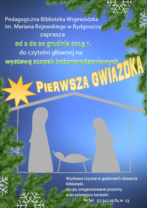 Zbliżają się święta Bożego Narodzenia. Pragnąc wprowadzić Państwa w ten świąteczny czas Pedagogiczna Biblioteka Wojewódzka im. M. Rejewskiego w Bydgoszczy przygotowała wystawę „Pierwsza gwiazdka” poświęconą tradycji szopek bożonarodzeniowych. Wystawę będzie można zobaczyć w dniach 2 – 20 grudnia 2019 r. w czytelni głównej.