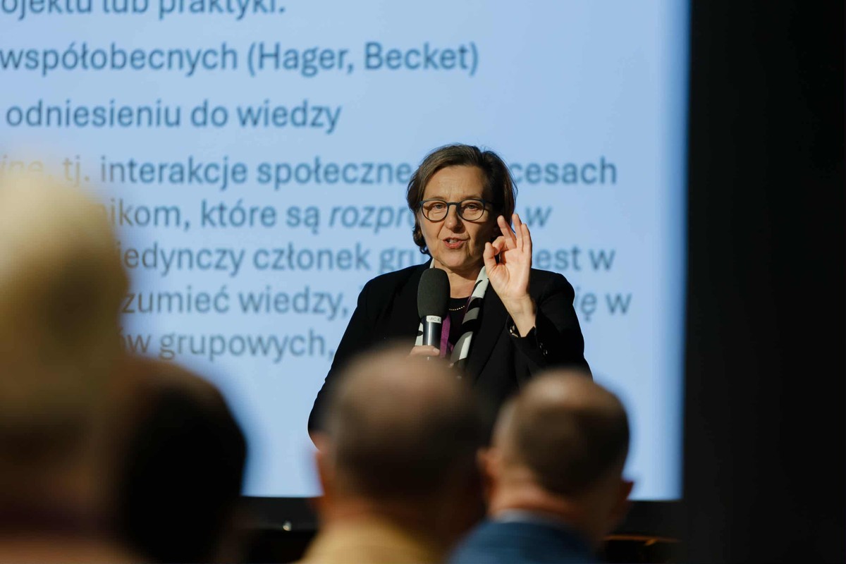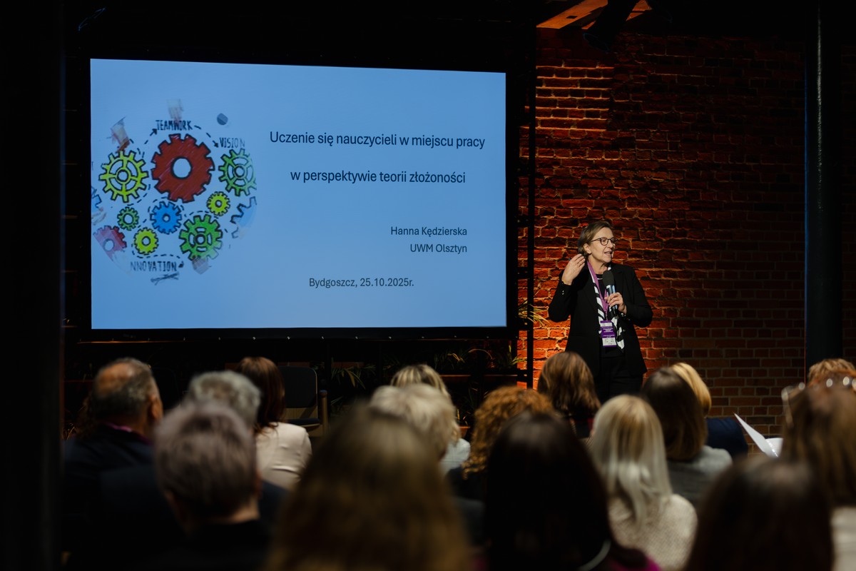 Pierwszy wykład pt. „Uczenie się nauczycieli w miejscu pracy – w perspektywie teorii złożoności” wygłosiła dr hab. Hanna Kędzierska, prof. Uniwersytetu Warmińsko-Mazurskiego w Olsztynie. W swoim wystąpieniu podkreśliła znaczenie środowiska pracy, relacji i współpracy jako nieodzownych elementów rozwoju zawodowego nauczyciela. Zwróciła uwagę na ideę „trzeciej przestrzeni” – miejsca wolnego od formalnych ról, w którym możliwa jest autentyczna rozmowa i wspólne poszukiwanie sensu w edukacji.