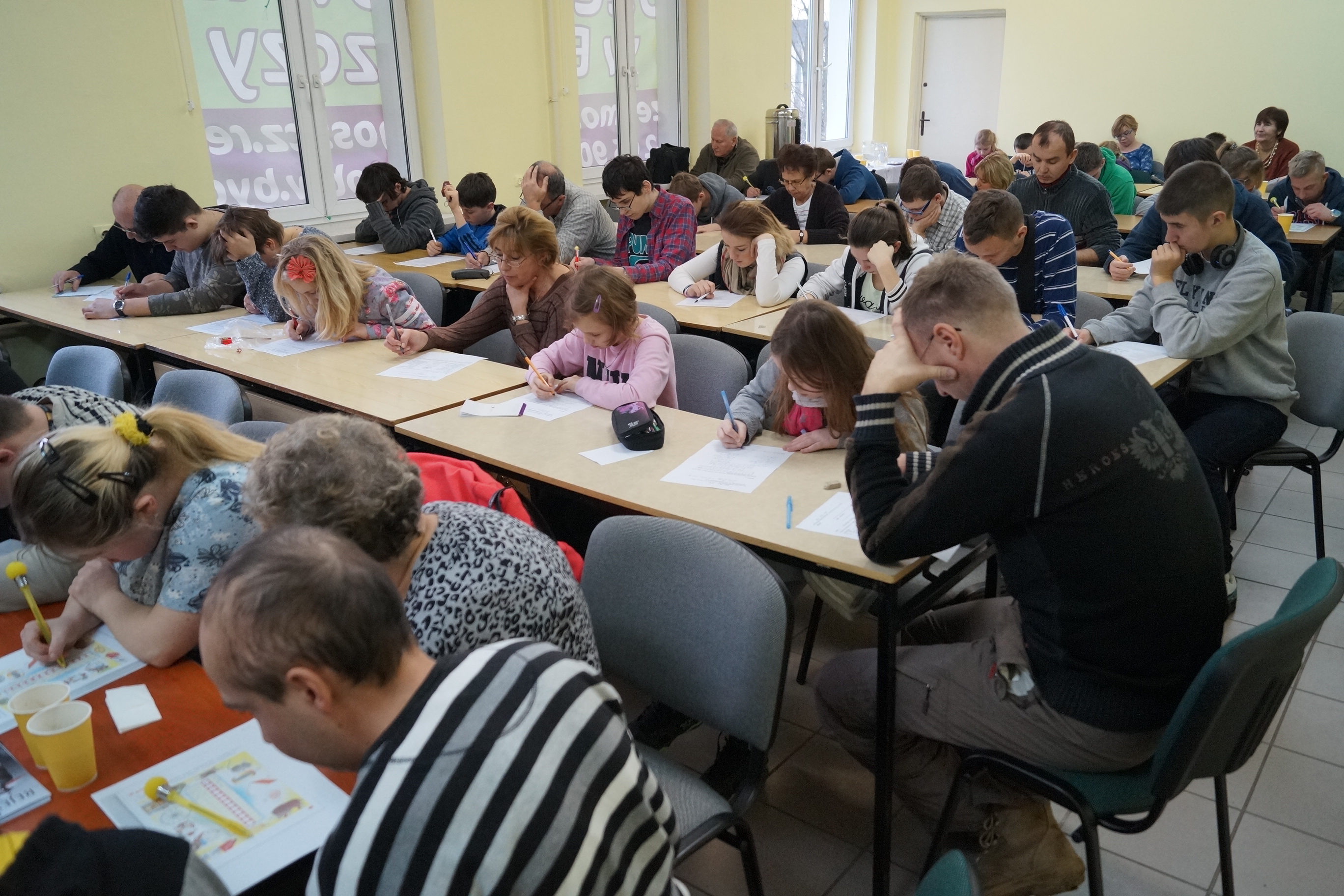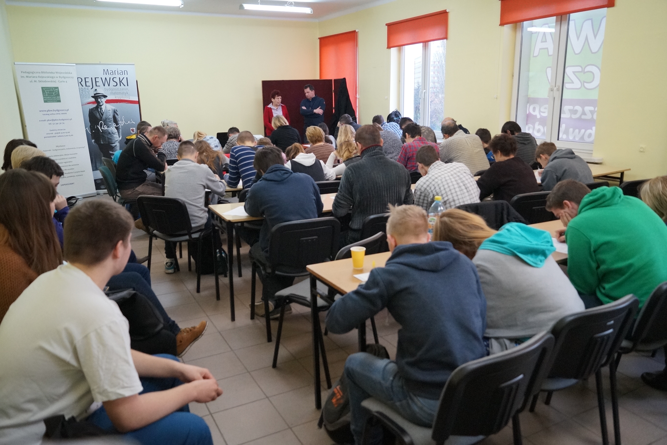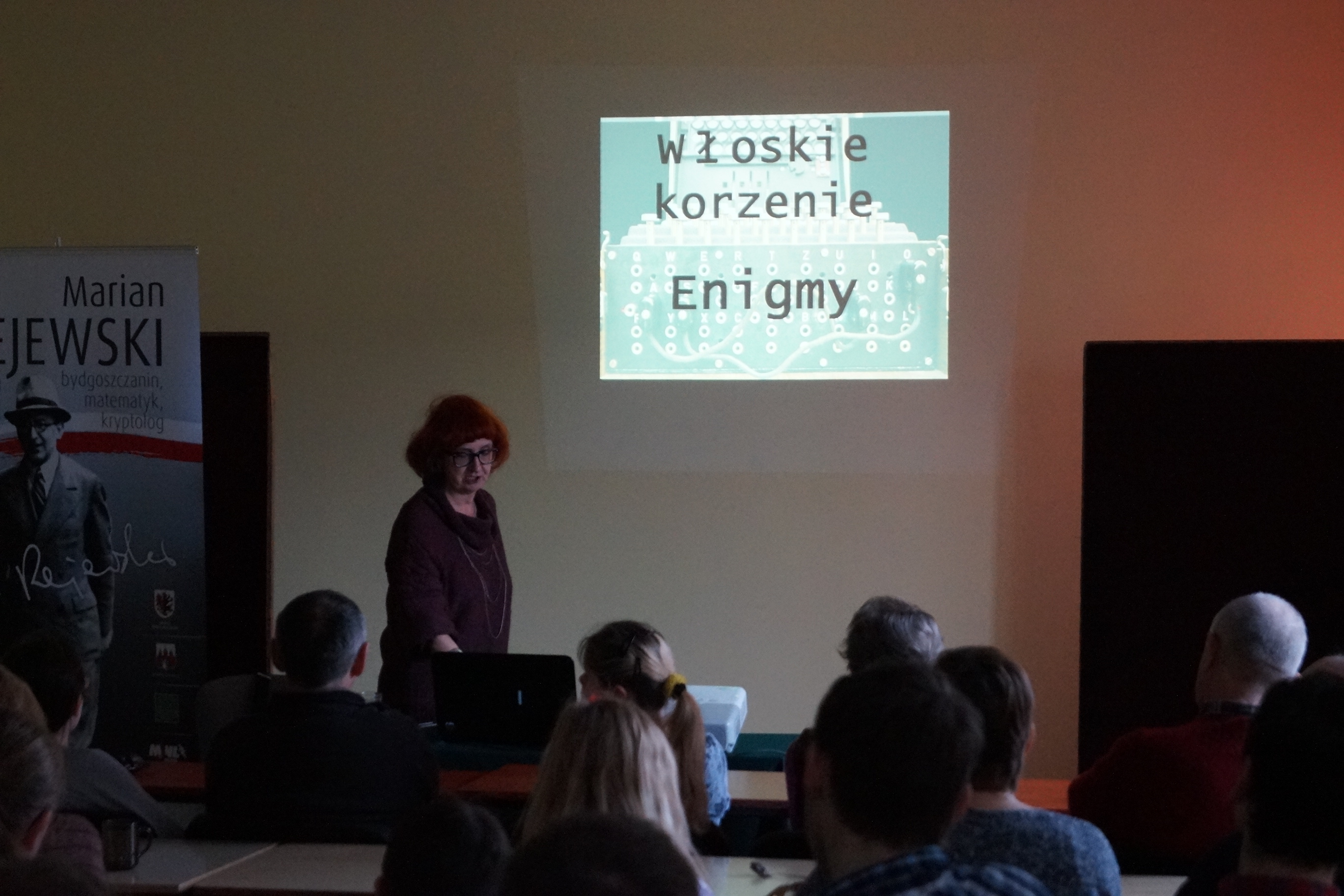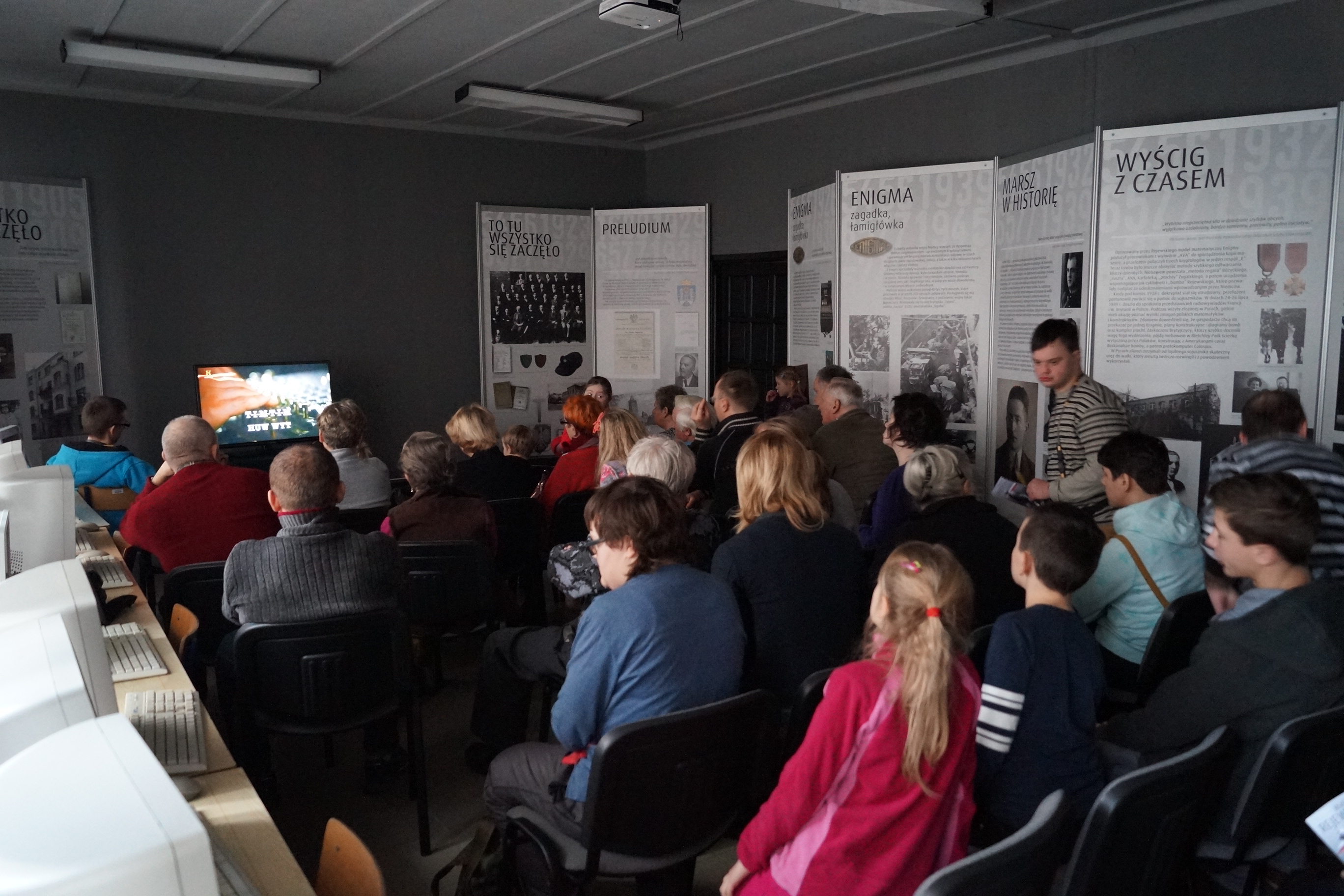 Tam odbył się drugi etap spotkania, pod hasłem „Z matematyką w tle”. Zainaugurowała je prezentacja Barbary Zapalskiej, pt. „Włoskie korzenie Enigmy”. Następnie blisko 50 uczestników, podzielonych na pięć grup wiekowych, wzięło udział w konkursie szarad i zagadek matematycznych. Uczestnicy Rajdu, którzy nie zgłosili chęci udziału w konkursie mieli w tym czasie szansę zaznajomić się z naszą mobilną wystawą o M. Rejewskim, zwiedzić Muzeum Oświaty oraz skorzystać z projekcji filmu „Enigma” z serii „Polscy Bohaterowie Drugiej Wojny Światowej”, udostępnionego dzięki uprzejmości TV „History”. Można było też obejrzeć prace plastyczne młodzieży, stworzone w ramach konkursów poświęconych M. Rejewskiemu.