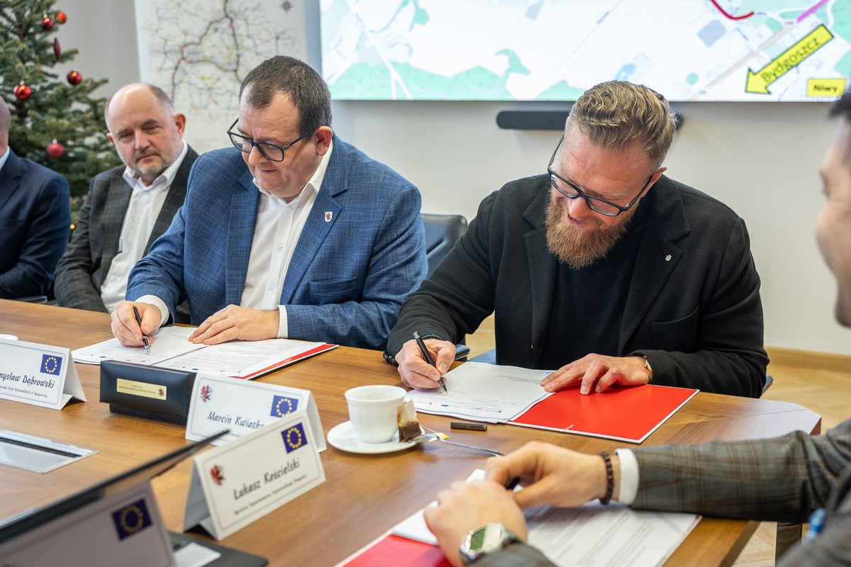 The contract was signed by Przemysław Dąbrowski, Director of the Regional Roads Authority, and Marcin Kwiatkowski, President of Marbruk. The meeting was also attended by Bydgoszcz County Governor Piotr Kozłowski, Osielsko Municipality Head Janusz Jedliński, and Osielsko Municipal Councillor Marek Protasewicz.