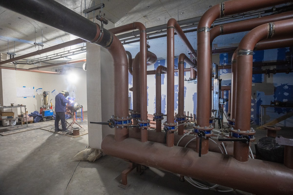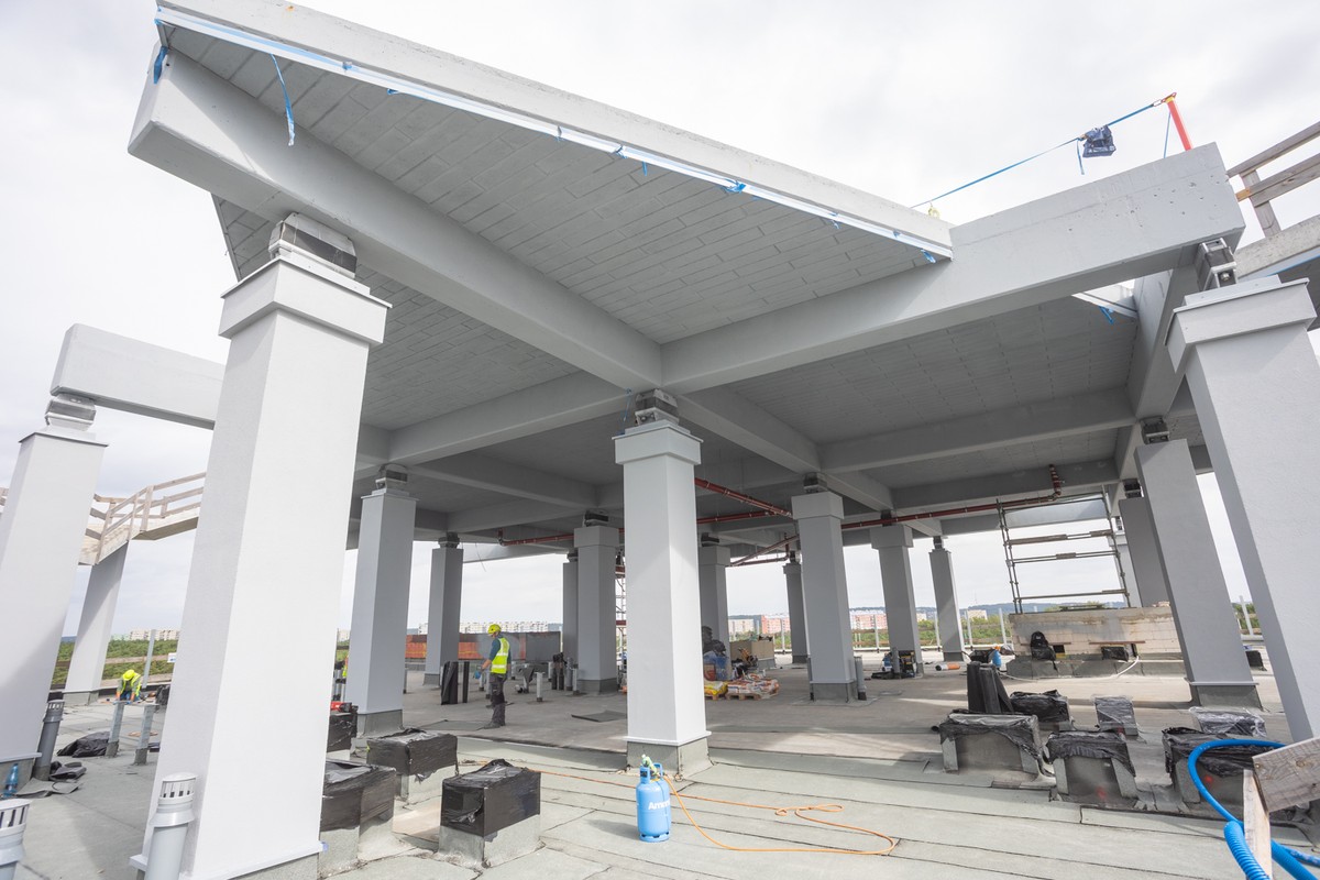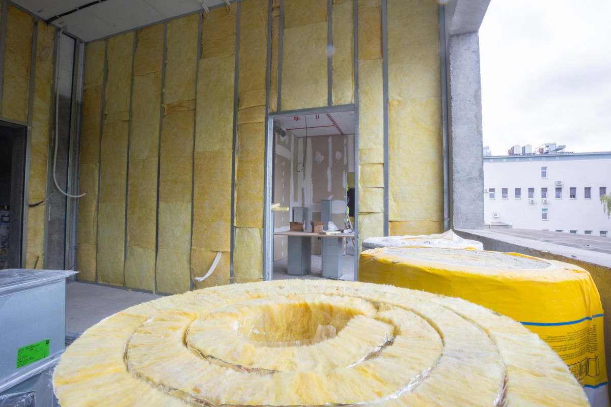 The contractors are currently continuing masonry, installation, and finishing works, including partition wall installation, reinforcement of walls and ceilings for medical equipment, façade panel installation, plastering, flooring, spray painting, and sheet-metal works for the helicopter landing pad.