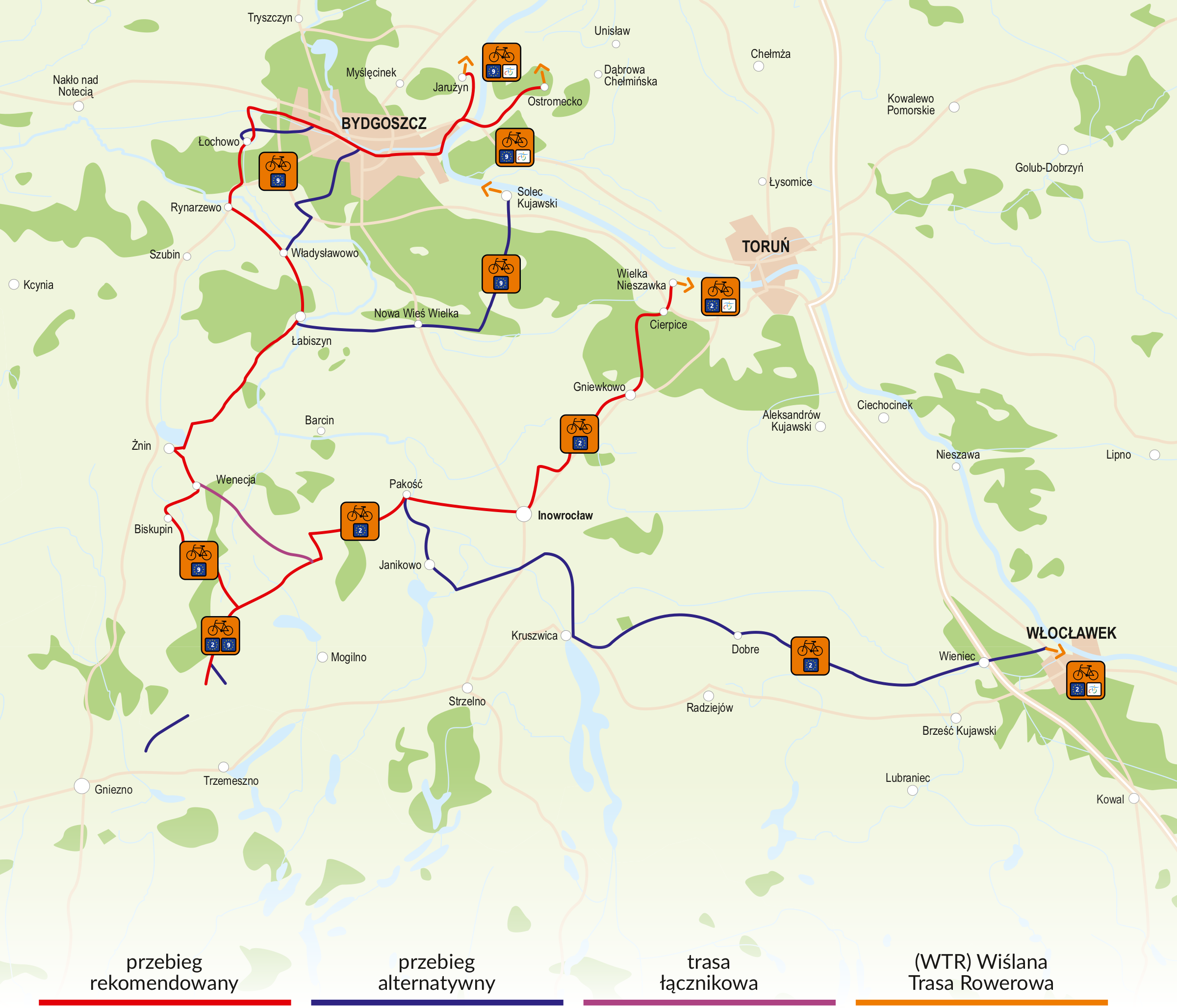 The recommended routes for EuroVelo 2 and EuroVelo 9 in the Kujawsko-Pomorskie Region, along with connecting routes (excluding sections overlapping with the Vistula Bicycle Route outside Bydgoszcz), will require marking 206 km of new bike routes and the construction or refurbishment of 67 km of bicycle and local roads. A summary of the proposed route concept is attached. The complete study, however, is more extensive, comprising a 100-page document, graphic files, and data in shp and gpx formats.
