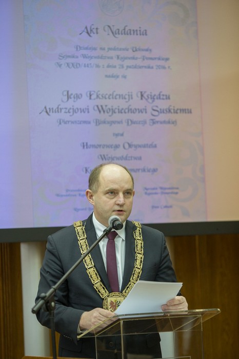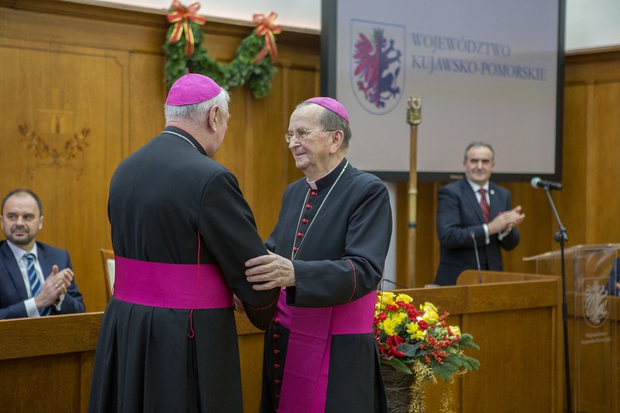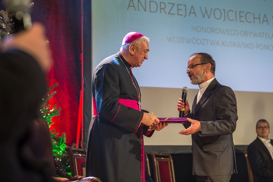 – To jego dziełem jest organizacja od podstaw struktur i instytucji naszej nowo utworzonej w 1992 roku diecezji. Uznając, że podstawą współczesnego społeczeństwa jest wspólnota lokalna, położył nacisk na budowę sfery służącej integracji społecznej i katolickiej formacji intelektualnej i duchowej.  Biskup Andrzej – dla wielu mentor, dla wszystkich dobry gospodarz, człowiek dialogu –  jest postacią cieszącą się wielkim, niepodważanym i powszechnym szacunkiem – podkreśla marszałek Piotr Całbecki. – Tytuł Honorowego Obywatela Województwa Kujawsko-Pomorskiego po raz kolejny trafia w dobre ręce.