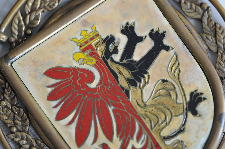 Na dolne ogniwo okrągłe nałożona jest plakieta wykonana również z żółtego metalu. Na plakiecie znajduje się Herb Województwa Kujawsko-Pomorskiego wykonany techniką emalii komórkowej.