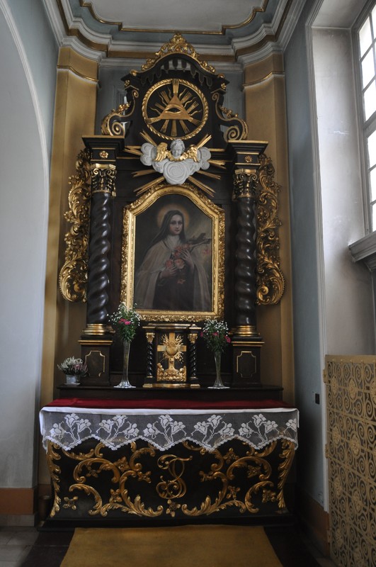 Mensa w kształcie czworoboku, antependium ozdobione złoconymi ornamentami – motywy roślinne. Retabulum w części środkowej płaskie, wypełnione obrazem przedstawiającym świętą Teresę, osadzonym w złoconej ramie z zakończeniem wklęsło wypukłym. Flankowane spiralnymi kolumnami na wysokich cokołach, zwieńczonymi korynckimi głowicami. Całe retabulum zakończone gierowaniem, na środku którego znajduje się rzeźba głowy anielskiej na obłoku, z którego rozchodzą się złote promienie. Widoczna jest destrukcyjna działalność drewnojadów. Obiekt jest częściowo przemalowany. Obraz św. Teresy jest silnie zabrudzony. Werniks mocno ściemniały oraz zażółcony. Płótno obwisłe, dość silnie zdeformowane.