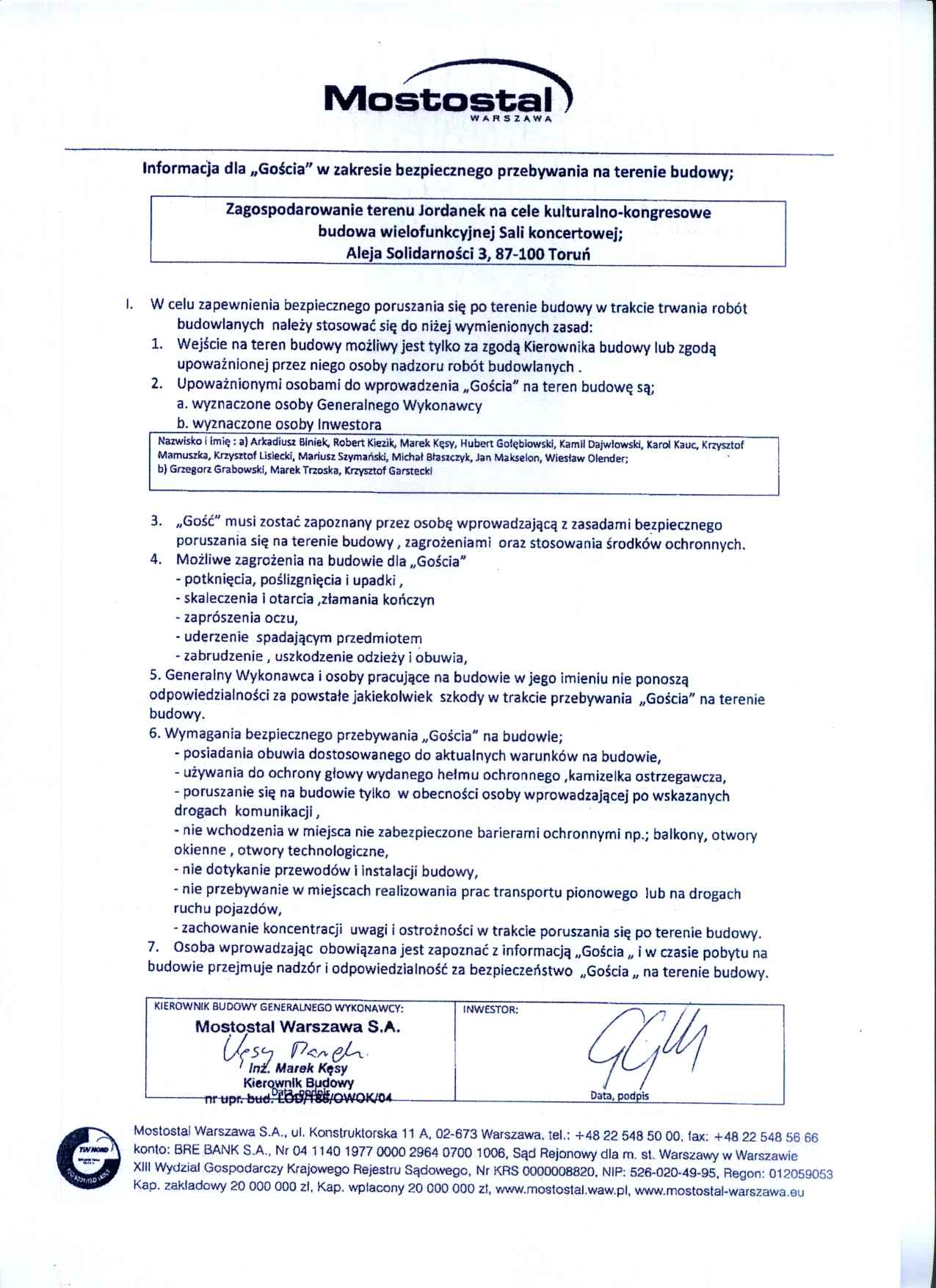 – zapoznać się z informacją „Mostostalu” w zakresie bezpiecznego przebywania na terenie budowy dla gości