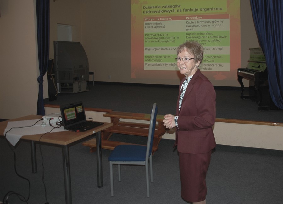Po przywitaniu gości głos zabrała Pani Prof. dr hab. Irena Ponikowska, która przedstawiła prezentację pn. „Potencjał polskiego lecznictwa uzdrowiskowego dla realizacji nowej oferty zdrowotnej dla seniorów”. W swoim wystąpieniu Pani Profesor przybliżyła zebranym tematykę związaną z balneologią i zagadnieniami wiążącymi się z rolą i zadaniami lecznictwa uzdrowiskowego.