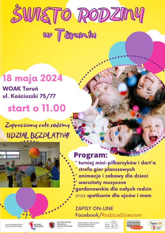 W kryzysie relacji, pandemii samotności i cyfrowej rewolucji, to właśnie rodzina powinna stanowić fundament wsparcia dla dziecka. Widząc potrzebę inwestowania w rodziców i ich kompetencje, Departament Spraw Społecznych i Zdrowia Urzędu Marszałkowskiego Województwa Kujawsko-Pomorskiego w Toruniu we współpracy z fundacją „Rodzice Dzieciom Fundacja Dobrej Edukacji” z powodzeniem zainicjował w 2021 roku organizację cyklicznego już wydarzenia „Święto Rodziny”.  Serdecznie zapraszamy do wspólnej zabawy i wzmocnienia więzi rodzinnych w ramach wydarzenia z okazji „Święta Rodziny”. Spotkanie odbędzie się 18 maja w godzinach 11.00-15.00 w Wojewódzkim Ośrodku Animacji i Kultury przy ulicy Kościuszki 75/77 w Toruniu.