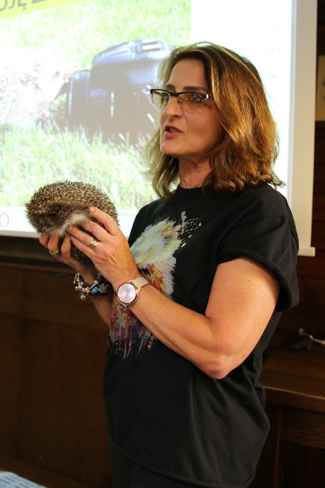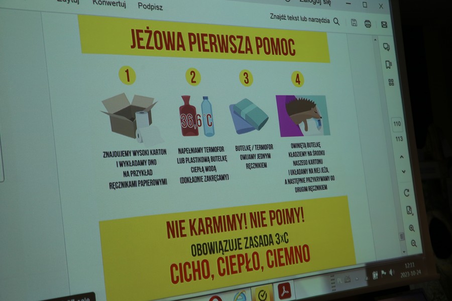 Wolontariusze ośrodka rehabilitacji podzielili się autentycznymi losami jeży, które do nich trafiają, poranione, po wypadkach czy z infekcjami. Nauczyli nas też jak udzielać w takich przypadkach pierwszej pomocy i jakich błędów nie popełniać (fot.1). Wskazali błędy i sytuacje często nieświadomie popełniane przez człowieka zagrażające bezpieczeństwu i życiu jeży, np. koszenie trawy podkaszarką bez uprzedniego sprawdzenia zakrzaczeń, wysypywanie ogólnodostępnych środków chemicznych na ślimaki, szczury, itp. czy też przenoszenie dorosłych jeży do lasu lub parku bez uprzedniego sprawdzenia czy są w pobliżu młode jeże.