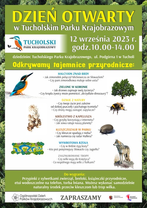 Tucholski Park Krajobrazowy zaprasza na wydarzenie „Dzień otwarty w Tucholskim Parku Krajobrazowym”, który odbędzie się w dniu 12 września 2023 r. (wtorek) w godz. 10.00-14.00 na dziedzińcu Tucholskiego Parku Krajobrazowego przy ul. Podgórnej 1 w Tucholi w ramach Ogólnopolskiego Dnia Parków Krajobrazowych. Wspólnie odkryjemy tajemnice przyrodnicze i odpowiemy na zagadkowe pytania. Uczestnicy będą mogli zdobyć: przypinki z sylwetkami zwierząt, breloki, książeczki przyrodnicze, etui wodoszczelne na telefon, torby lniane a także wykonać i zabrać ze sobą naturalny środek przeciw kleszczom oraz trop wilka.