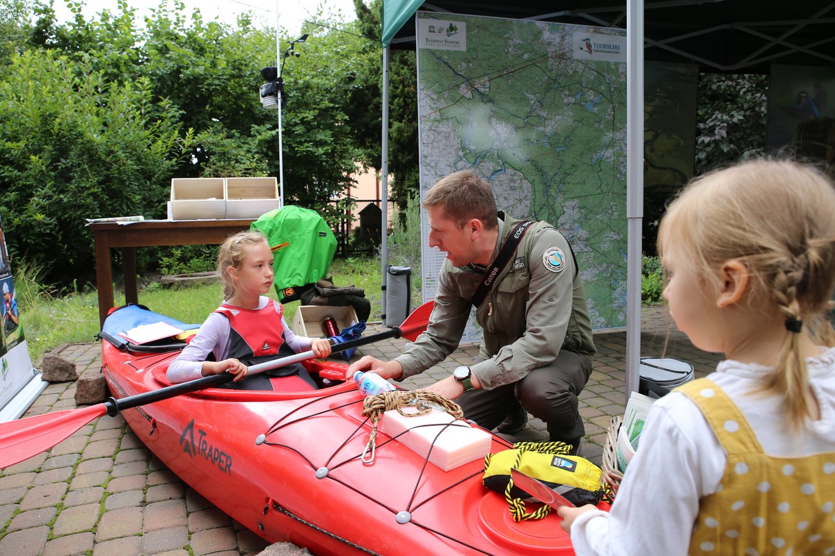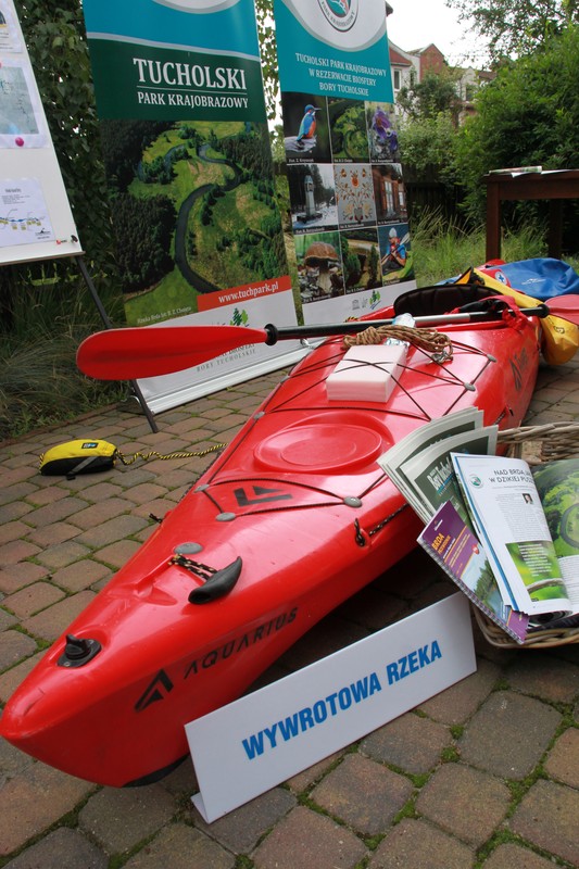 Rzeka Brda do główna oś hydrologiczna naszego parku. To też wodny szlak kajakowy i niepowtarzalna atrakcja spędzenia wolnego czasu w Tucholskim Parku Krajobrazowym. Pracownicy parku instruowali jak z zachowaniem bezpieczeństwa można uczestniczyć w spływie kajakowym Brdą. Informowaliśmy o możliwych trudnościach, jak je pokonać i jak przygotować się na tą przygodę. Mniej doświadczonych kajakarzy zaprosiliśmy na spływ kajakowy Wielkim i Małym Kanałem Brdy. Chętni mogli skorzystać z oferty firm wypożyczających kajaki i zabrać ze sobą informatory i mapy turystyczne. W ekspozycji z kolekcji prywatnej Pana Ryszarda Szulczyńskiego, pokazaliśmy kajaki retro, których już nie ujrzymy na wodzie. Podziw budził kajak drewniany z żaglami. Mówiąc o Brdzie nie mogło też zabraknąć zimorodka, szmaragdowego, ptaka który żyje nad rzeką. Mówiliśmy też o ochronie tego ptaka i zasadach korzystania z turystyki wodnej, aby go nie wypłoszyć. Energorowerem ładując swój telefon, można było powędrować szlakami rowerowymi, które są wytyczone na terenie parku. Promowaliśmy korzystanie z turystyki kwalifikowanej zgodnie z szacunkiem do przyrody.