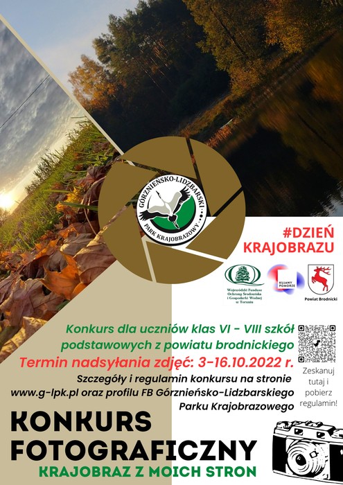 Wydarzeniem towarzyszącym obchodom „Dnia krajobrazu” w Górznieńsko-Lidzbarskim Parku Krajobrazowym jest konkurs fotograficzny pn. „Krajobraz z moich stron”, skierowany do uczniów klas VI-VIII ze szkół z powiatu brodnickiego. Celem konkursu jest popularyzacja „Międzynarodowego Dnia Krajobrazu”, pogłębianie zainteresowań przyrodniczych, budowanie emocjonalnego podejścia do krajobrazu, a także promocja walorów przyrodniczo-krajobrazowych Górznieńsko-Lidzbarskiego Parku Krajobrazowego oraz powiatu brodnickiego. Termin przesyłania zdjęć trwa 03-16.10.2022 r., po czym nastąpi ocena i wybór najlepszych zgłoszonych fotografii oraz głosowanie internetowe. Więcej szczegóły na plakacie informacyjnym, regulaminie konkursu oraz stronie internetowej GLPK: https://parki.devkujawsko2.pollyart.eu/glpk/historia-parku/wydarzenia-i-informacje/2775-mlodziezowy-tydzien-krajobrazowy-w-gorzniensko-lidzbarskim-parku-krajobrazowym. Wyłonieni w trakcie głosowania laureaci konkursu otrzymają nagrody rzeczowe, których zakup został sfinansowany ze środków Wojewódzkiego Funduszu Ochrony Środowiska i Gospodarki Wodnej w Toruniu. Przewiduje się także przyznanie pięciu wyróżnień.