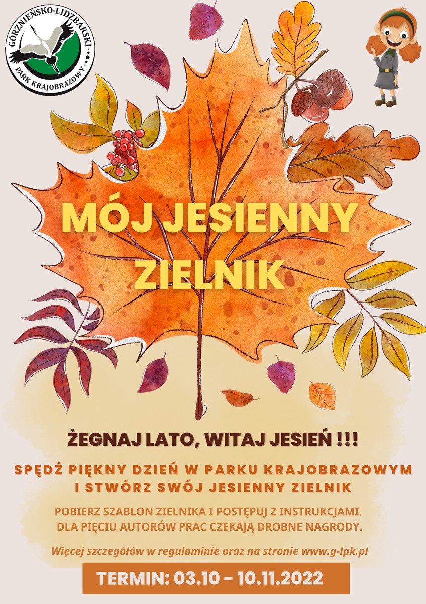 Górznieńsko-Lidzbarski Park Krajobrazowy zachęca do jesiennych spacerów po lesie oraz wykonania konkursowego zielnika pt. „Mój jesienny zielnik”. Pobierz szablon i stwórz zielnik postępując z instrukcjami Zosi i Tadeusza. Dla pięciu autorów prac czekają drobne nagrody. Konkurs dedykowany jest dzieciom i młodzieży szkolnej. Więcej szczegółów na plakacie informacyjnym, regulaminie oraz stronie internetowej GLPK