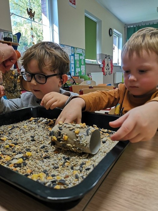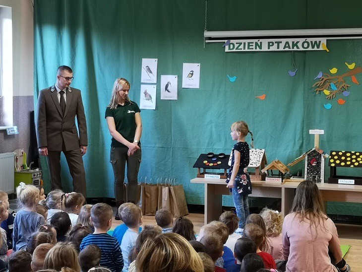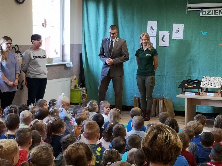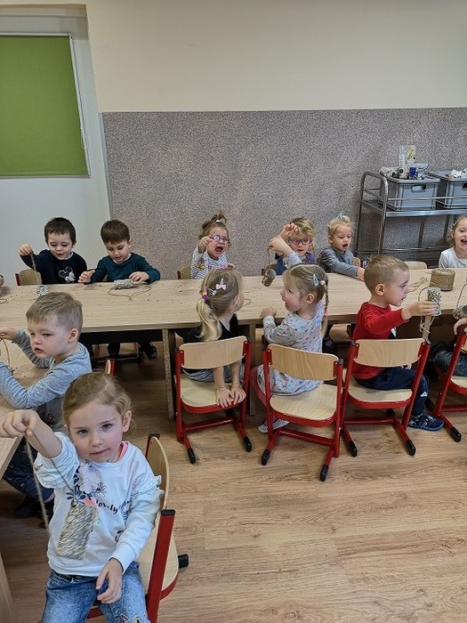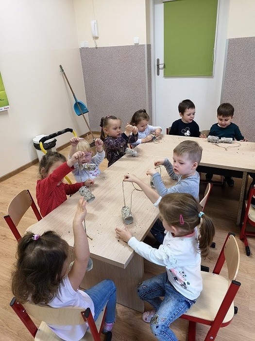 Dzieci z pomocą rodziców wykonały bardzo oryginalne karmniki. W celu rozstrzygnięcia konkursu przedszkole zaprosiło przedstawiciela Krajeńskiego Parku Krajobrazowego. Pan Krzysztof Wojtkowiak, p.o. dyrektora parku, wręczył poszczególnym grupom nagrody. Po uroczystym rozstrzygnięciu konkursu Agnieszka Szliep pełniąca funkcję Zielonego Edukatora przeprowadziła w grupie Biedronek i Elfików zajęcia dotyczące dokarmiana ptaków. Dzieci po krótkim wstępie teoretycznym miały możliwość samodzielnie wykonać alternatywne karmniki.