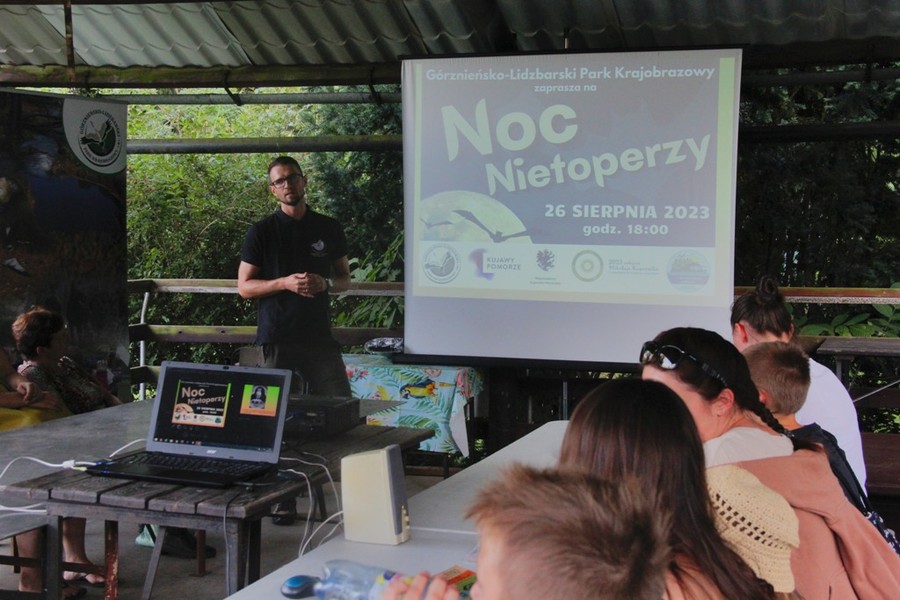 Na niecodzienne spotkanie z tymi wyjątkowymi ssakami mogli liczyć uczestnicy „Nocy Nietoperzy w Górznieńsko-Lidzbarskim Parku Krajobrazowym”, która odbyła się 26 sierpnia 2023 r. w ramach obchodów Międzynarodowej Nocy Nietoperzy. Na zaproszenie Parku, wydarzenie to poprowadzili specjaliści chiropterolodzy – dr Krzysztof Kasprzyk oraz dr hab. prof. UMK Michał Wojciechowski z Katedry Zoologii i Ekologii Kręgowców Wydziału Nauk Biologicznych i Weterynaryjnych Uniwersytetu Mikołaja Kopernika w Toruniu. Zainteresowanych nietoperzami nie brakowało! Pod okiem pracowników Parku, uczestnicy budowali skrzynki lęgowe dla tych latających ssaków, do rozwieszenia na drzewach. Wysłuchali również ciekawej prelekcji na temat biologii i ekologii oraz znaczenia nietoperzy dla przyrody i człowieka, a także mieli możliwość zobaczyć jak się je odławia, jak oznacza do gatunku, rozpoznaje ich płeć i wiek. Gwiazdą wieczoru stał się najbardziej znany gacek brunatny, który wzbudził niemałą sympatię uczestników, doskonale prezentując się zgromadzonym. Dla niektórych było to pierwsze takie spotkanie z nietoperzami w życiu. Wszystkie odłowione nietoperze otrzymały obrączki z numerem i bezpiecznie wróciły na wolność. Uczestnicy dowiedzieli się jak chronić rodzime gatunki, a także o tym jak szkodliwe dla nietoperzy jest zanieczyszczanie sztucznym światłem. Dzięki detektorom ultradźwiękowym można było również posłuchać, niesłyszalnych dla ucha człowieka odgłosów nietoperzy, posługujących się tzw. echolokacją.