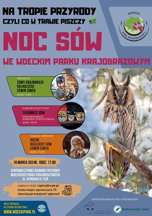 Program tegorocznych warsztatów stacjonarno-terenowych „Noc Sów we Wdeckim Parku Krajobrazowym” będzie obejmował w części stacjonarnej prelekcję na temat „Sowy krajobrazu rolniczego” połączoną z rozpoznawaniem ich głosów, którą poprowadzi dla Nas Edwin Siwek ze Stowarzyszenia Ochrony Sów. W programie przewidziane jest również wyjście w teren na nocne nasłuchiwanie sów, które zakończone zostanie wspólnym ogniskiem (prowiant – kiełbaski, chleb i itp. we własnym zakresie). Wyjście w teren uzależnione będzie od panujących warunków pogodowych, (prosimy o stosowny ubiór), mile widziane latarki.