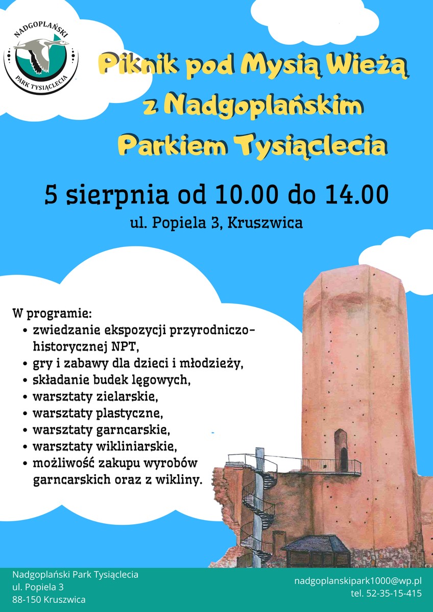 Nadgoplański Park Tysiąclecia zaprasza na Piknik pod Mysią Wieżą, który odbędzie się w dniu 05 sierpnia 2023 r. (sobota) w godz. 10.00-14.00 przy siedzibie Parku, przy ul. Popiela 3 w Kruszwicy.
