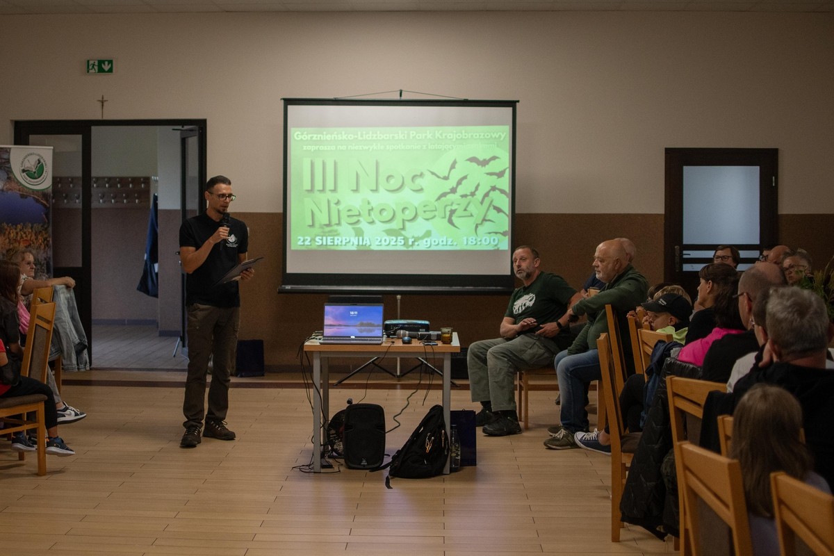Już po raz trzeci entuzjaści i ciekawi tych niezwykłych, latających ssaków, spotkali się w Górznieńsko-Lidzbarskim Parku Krajobrazowym, aby świętować „Międzynarodową Noc Nietoperzy”. W piątek 22 sierpnia świetlica wiejska w Bartniczce wypełniła się po brzegi uczestnikami głodnymi wiedzy o nietoperzach. W świat tych niesamowitych zwierząt wprowadzili ich chiropterolodzy z Katedry Zoologii i Ekologii Kręgowców WNBiW UMK – prof. dr hab. Michał Wojciechowski i dr Krzysztof Kasprzyk. Podczas prelekcji można było dowiedzieć się więcej o biologii oraz ciekawostkach dotyczących nietoperzy, ich znaczeniu dla przyrody i człowieka oraz o ochronie rodzimych gatunków, w tym o szkodliwości zanieczyszczenia światłem. Rozwianych zostało również kilka wzbudzających strach i demonizujących te zwierzęta mitów – nikt z obecnych na pewno nie będzie się już obawiał o swoje włosy! Część prelekcji poświęcona była prezentacji wyników monitoringu budek rozrodczych dla nietoperzy, przeprowadzonego na terenie Parku w połowie lipca.
