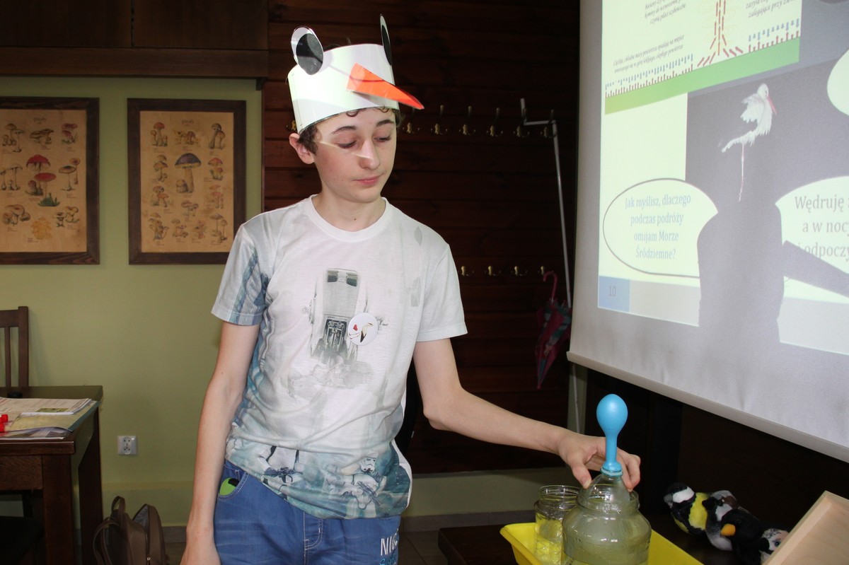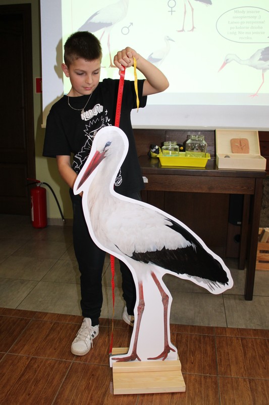 Z wykorzystaniem prezentacji multimedialnej przekazywaliśmy szczegółową wiedzę o biologii, fizjologii, instynktach i fenomenach bociana białego. Porównaliśmy go z jego negatywem – bocianem czarnym. Mówiliśmy o wyglądzie i przystosowaniach ptaków porównując bociana białego do siebie. Wyszukaliśmy cechy, które umożliwiają ptakom latanie. Prześledziliśmy trasy wędrówek populacji wschodnioeuropejskiej bociana białego. Na podstawie przeprowadzonego doświadczenia poznaliśmy mechanizm lotu szybowcowego i ślizgowego oraz  znaleźliśmy odpowiedź na pytanie, dlaczego bociany białe nie lecą przez M. Śródziemne. W trakcie zabawy w polowanie drapieżnika określiliśmy pożywienie bociana białego oraz zdementowaliśmy funkcjonujący mit, że najlepszym przysmakiem dla niego jest żaba. Budowanie gniazda na platformie lęgowej było okazją do wyciągnięcia wniosków nt. pozostających w środowisku plastikowych śmieciach: sznurkach do wiązania słomy i woreczkach foliowych, i zachętą do włączenia się w aktywną ochronę bociana. Dla uczniów była to też praktyczna nauka określenia co nazywamy sianem, a co słomą J Jak każda grupa, do oglądanej na filmie pary bocianów w gnieździe, uczniowie chętnie stworzyli podkład rozklekotanych bocianów wykorzystując do tego przygotowane patyki. Przedstawiliśmy nie tylko sielskie życie bociana, ale również zagrożenia populacji bociana białego w Polsce, czyhające na nie niebezpieczeństwa podczas podróży na zimowisko i podczas pobytu w Afryce.
