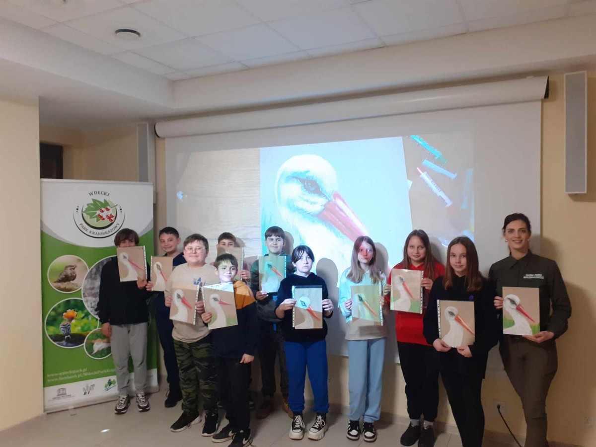 W drugiej części, uczniowie wzięli udział w grze terenowej, w której nie mogło zabraknąć bociana białego, podobnie jak w ostatniej, gdzie uczestnicy zgodnie z udzielonym instruktażem, namalowani bociana białego – w końcu ten rok należy do niego!