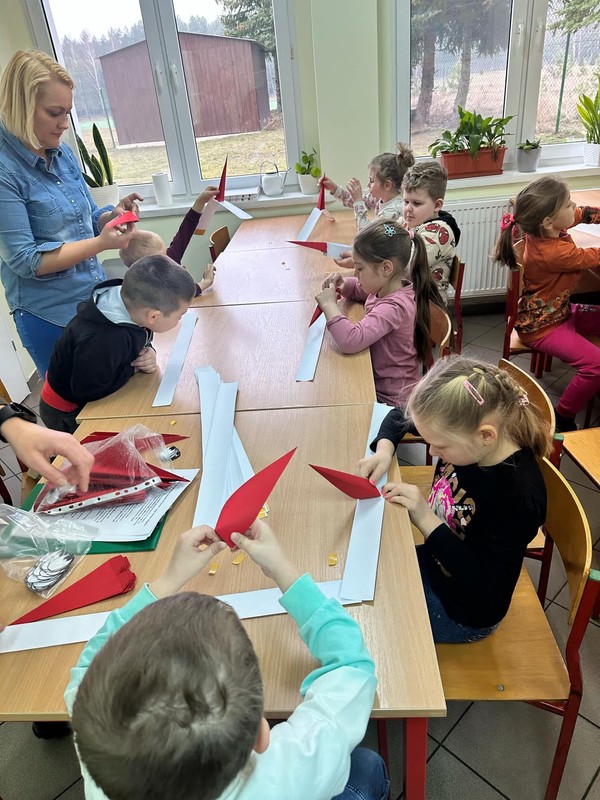 Na zakończenie zajęć, po sprawdzeniu wiedzy w formie zabaw z pytaniami, uczestnicy wykonali opaski z bocianimi dziobami, zapowiadając w ten sposób nadejście wiosny.