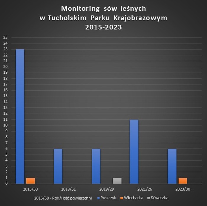 Pierwszą inwentaryzację sów leśnych w Tucholskim Parku Krajobrazowym przeprowadzono w kwietniu 2015 r. W trakcie nocnych nasłuchów na 50 powierzchniach zlokalizowano jedno stanowisko z włochatką (samiec) oraz 16 stanowisk z puszczykiem (14 samców i 9 samic) w tym 7 par.