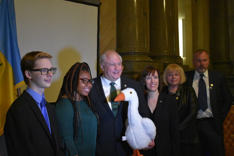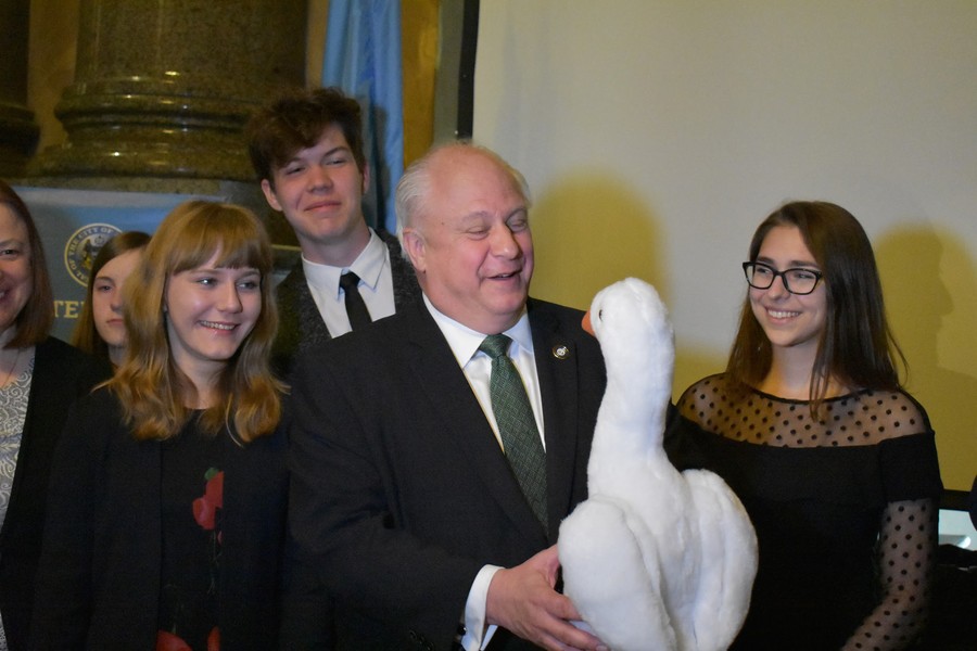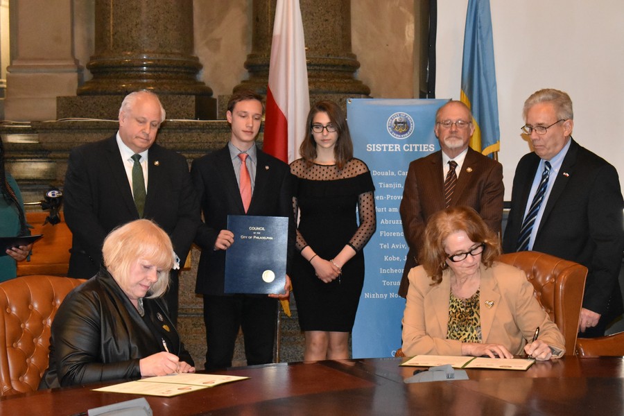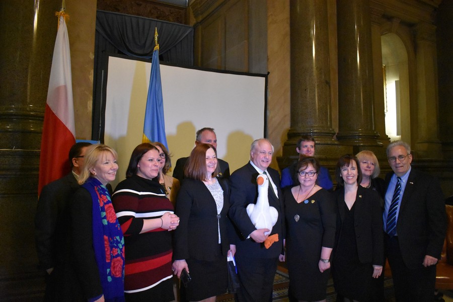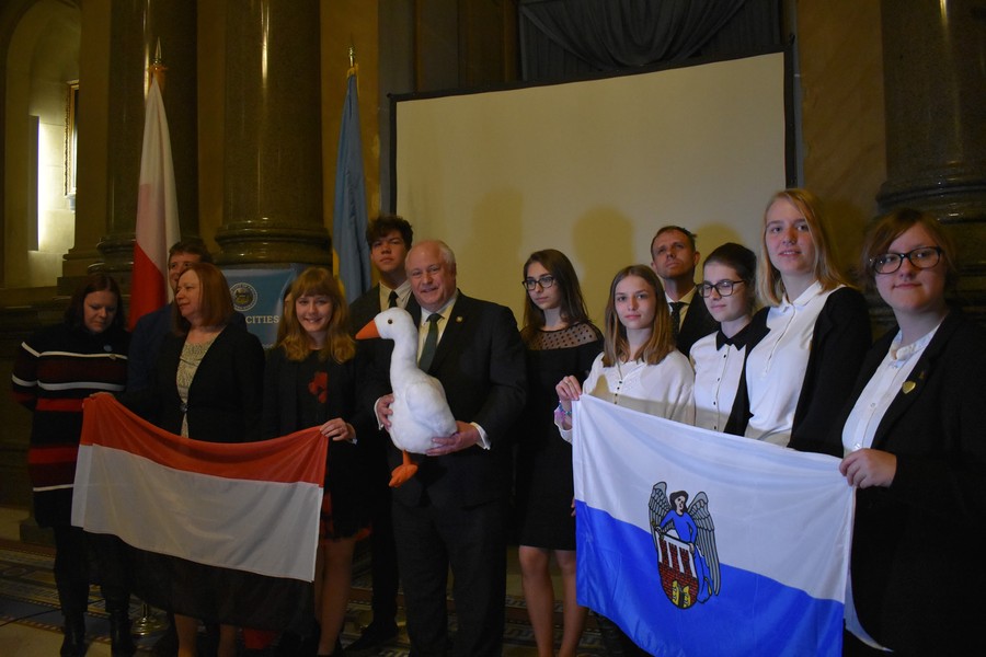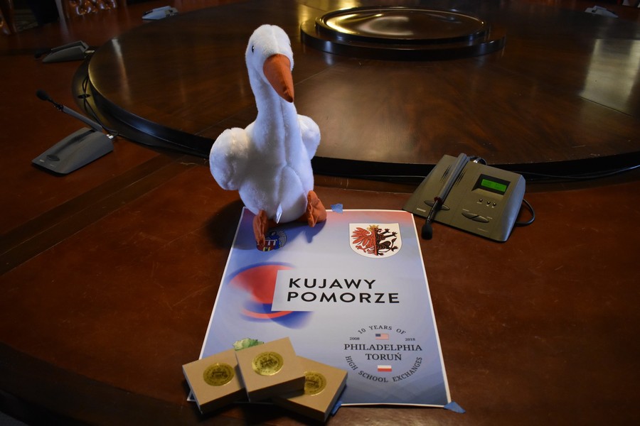 Fragmenty jego wypowiedzi można przeczytać na: http://philadelphia.cbslocal.com/2018/03/27/philadelphia-recognizes-students-in-sister-cities-program/, gdzie został również opublikowany materiał telewizyjny na temat wydarzenia. Kluczowym momentem spotkania było podpisanie jubileuszowych dokumentów oraz wręczenie kujawsko-pomorskiej maskotki – gąski radnemu miasta Filadelfia Al’owi Taubenberger’owi, wyjaśniając jej znaczenie dla naszego regionu. Cieszyła się ona ogromnym zainteresowaniem. Gąska została za oceanem jako pamiątka wizyty uczniów z Kujawsko-Pomorskiego razem z plakatem promującym oraz prezentacją.